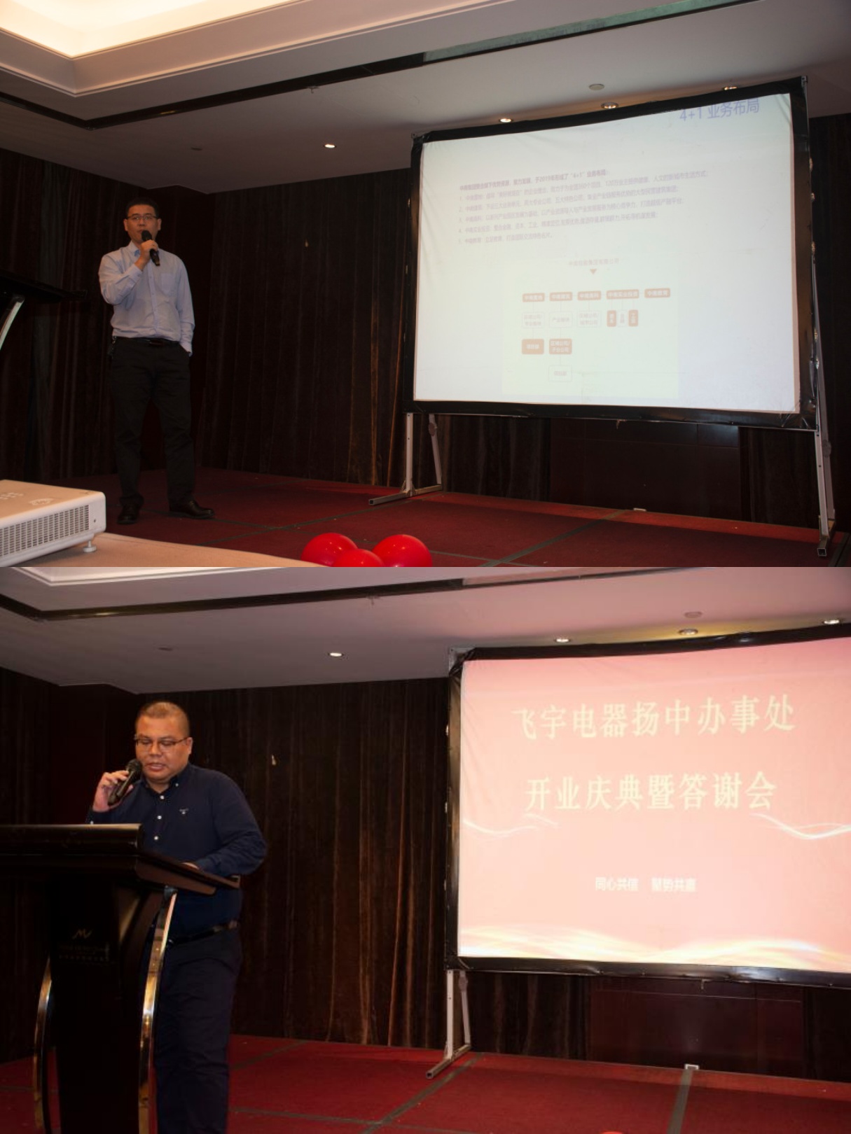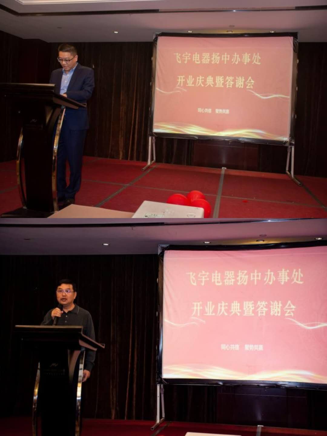 隨后,飛宇電器負(fù)責(zé)人韓宇逐次介紹了到場(chǎng)的嘉賓,向各位來賓對(duì)于公司的支持表示了誠(chéng)摯的感謝。韓總表示,揚(yáng)中辦事處的設(shè)立運(yùn)行,標(biāo)志著一個(gè)全新的經(jīng)營(yíng)及服務(wù)模式的誕生,飛宇電器運(yùn)營(yíng)團(tuán)隊(duì)將憑借自身強(qiáng)大的實(shí)力后盾和領(lǐng)先的市場(chǎng)意識(shí),緊密圍繞百億戰(zhàn)略目標(biāo),積極拓展內(nèi)外銷市場(chǎng),引領(lǐng)公司進(jìn)入一個(gè)全新的發(fā)展階段。工業(yè)黨委副書記龔利華代表工業(yè)事業(yè)部對(duì)揚(yáng)中辦事處的成立表示祝賀與支持,并預(yù)祝揚(yáng)中辦事處開業(yè)大吉,發(fā)展順利。